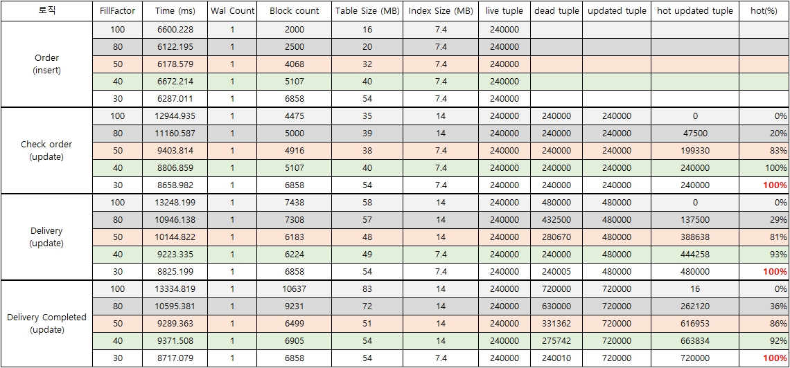 테이블 사이즈, 인덱스 사이즈, Wal Log 생성 빈도, Hot(%) 등을 테스트